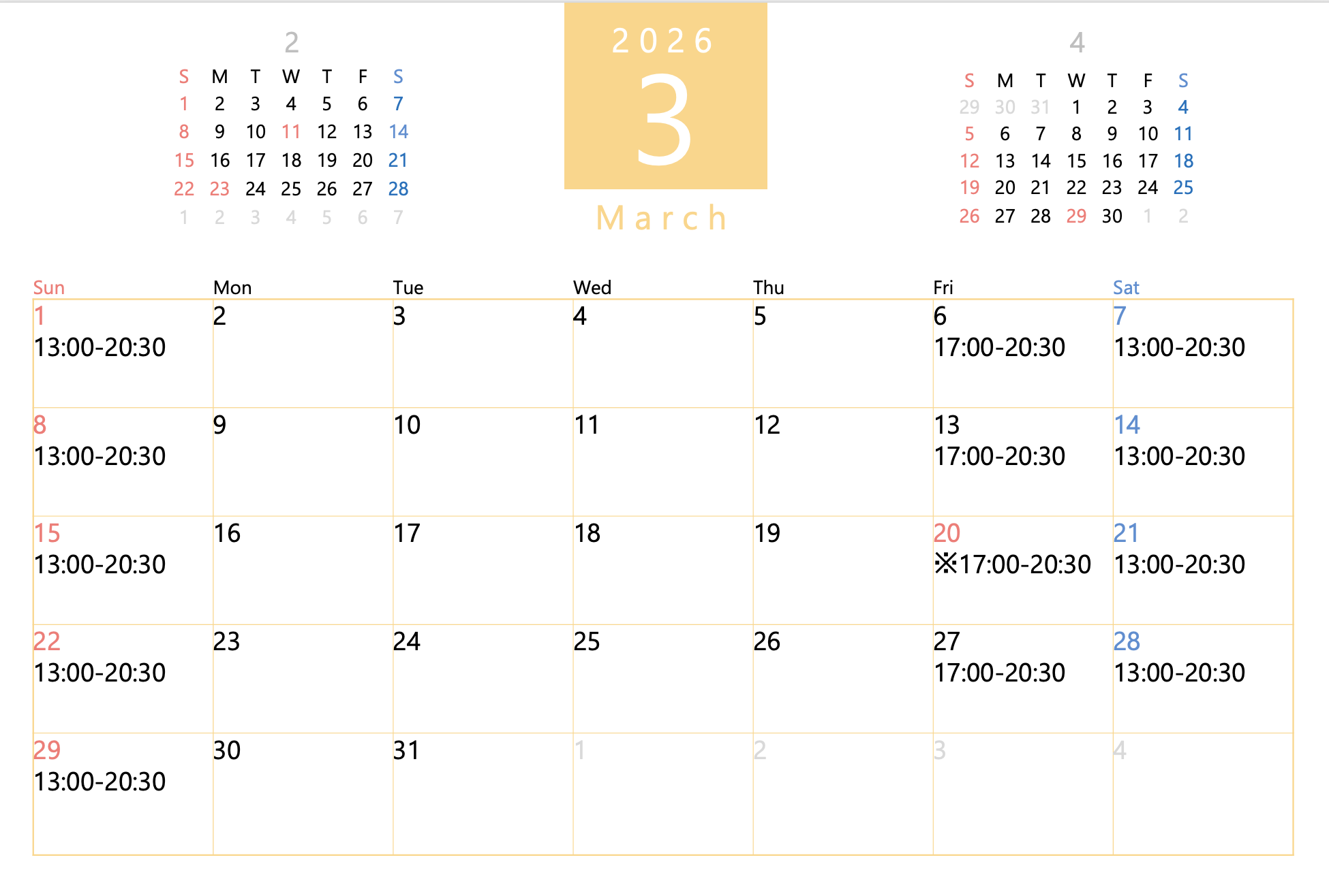 3月の営業カレンダー